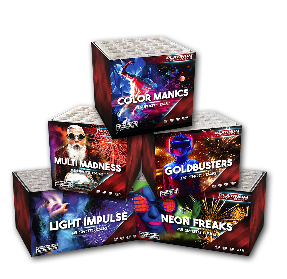 Ideaal voor wie houdt van tempo, kleur en diversiteit. Met vijf unieke cakes – Light Impuls, Neon Freak, Multi Madness, Color Maniacs en Gold Busters – krijg je een afwisselende show die continu verrast. Kleine prijs, grote show: elk van deze cakes heeft zijn eigen karakter en effectstijl.