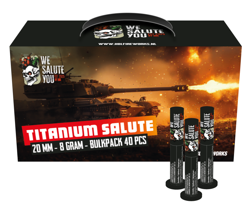 Maak kennis met de Titanium Salute Bulkpack 40St., de ultieme single-shot met een oorverdovende saluut. Deze krachtpatser is speciaal ontworpen door HBL Fireworks voor de liefhebber die zoekt naar de hardst mogelijke knal en een spectaculaire flits in de lucht.